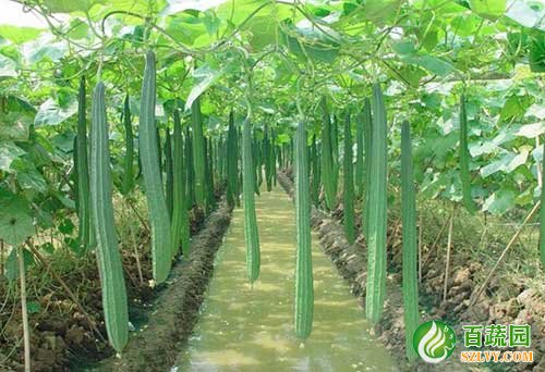 8、理瓜:開花結(jié)果期間,如幼瓜被棚架、葉片、蔓等阻礙不能自然下垂時(shí)容易變彎,因此要及時(shí)進(jìn)行理瓜,使之垂直懸掛于棚架內(nèi),提高絲瓜的商品性。